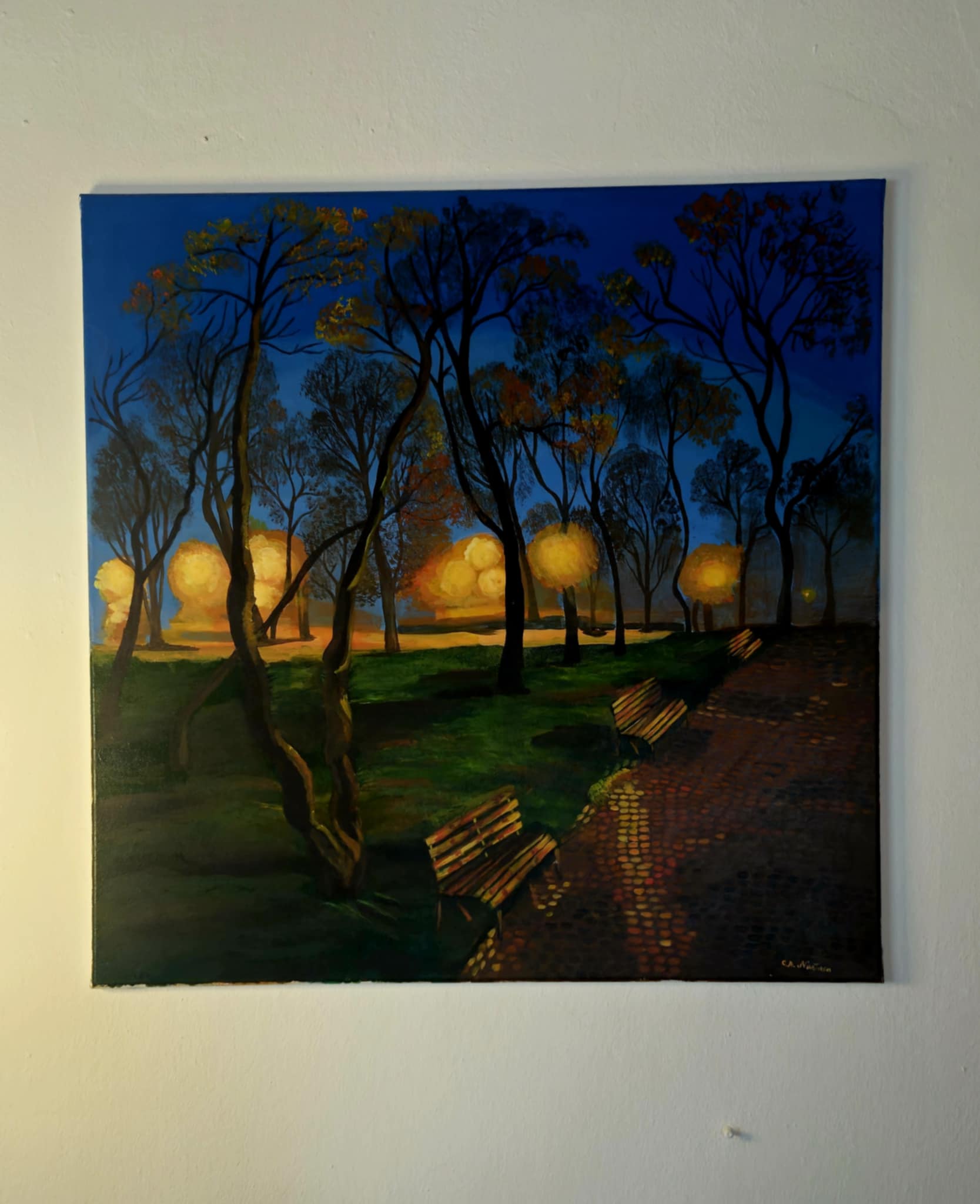 Is my favorite landscape,it has 80cmx80cm. This painting illustrate a park in the night with the glory of lights and how lights sets on benches and earth and concrete.